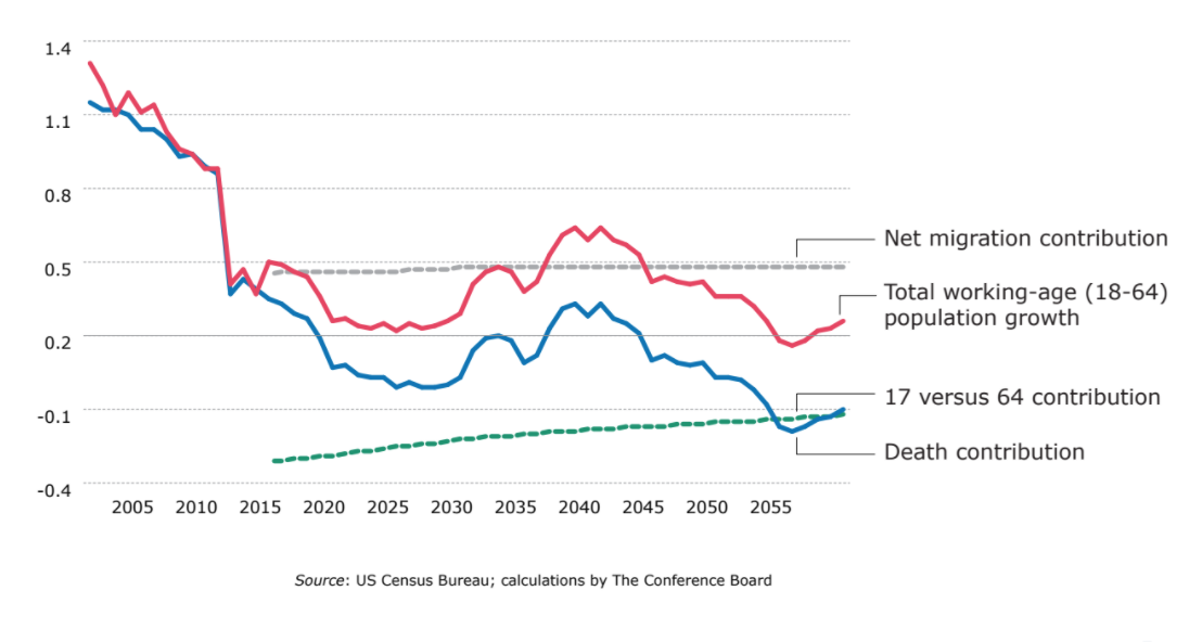 With the number of 17 and 64 year olds almost identical between 2015 and 2030, native-born labor force growth will be very slow
